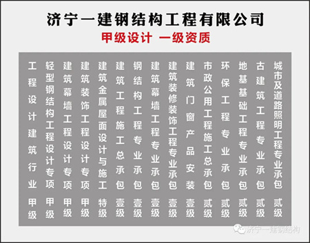 濟寧一建鋼結(jié)構(gòu)工程有限公司,隸屬中煤建設(shè)集團,集團注冊資金1.0158億元人民幣,下設(shè)工程部、設(shè)計部、技術(shù)部、質(zhì)檢部、生產(chǎn)部、安全部。擁有鋼結(jié)構(gòu)施工、設(shè)計雙甲資質(zhì)、制造壹級資質(zhì),幕墻施工、設(shè)計雙甲資質(zhì),裝飾裝修施工、設(shè)計雙甲資質(zhì),建筑金屬屋面設(shè)計與施工特級資質(zhì),門窗施工壹級資質(zhì),并具有對外承包施工資質(zhì)和勞務(wù)輸出資質(zhì)等九項國家甲級資質(zhì)。主要從事鋼結(jié)構(gòu)網(wǎng)架工程、管桁架工程、裝配式輕鋼別墅工程、膜結(jié)構(gòu)工程及大型儲罐工程的設(shè)計、生產(chǎn)與施工,公司相繼承攬了機場航站樓、體育場館、省級科技館、大型廠房、高速路服務(wù)站、國家石油儲庫、加油站、儲煤倉等各類工程,施工范圍涉及全國三十多個省、市、自治區(qū)及直轄市,工程質(zhì)量合格率100%,多年來榮獲國內(nèi)建筑界各類獎項100余個。